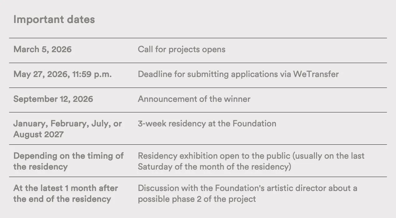 In some cases, collaboration with the Foundation may continue over the following months in order to follow up on the project (phase 2). This decision — made jointly with the winner and the Foundation's management — will be based on the progress of the work during the residency and the relevance of the avenues envisaged for the project. This could include, for example, an exhibition, workshops, a publication, a video clip, a conference, a symposium, or any other form of public sharing of the research conducted. Additional support of up to CAD 5,000 may be granted for this second stage. The amount allocated will be determined by the Foundation and the recipient, based on the nature of the project and the costs incurred for its completion.
