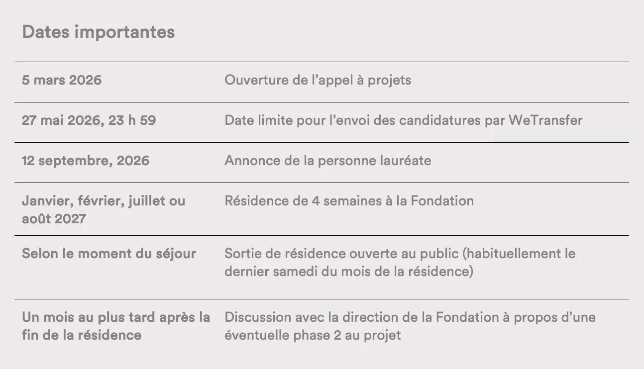 Sur la recommandation de son comité d’expert·e·s, la Fondation accorde par voie de concours annuel une bourse de 5 000 $ à 10 000 $ CA (selon l’étendue du projet) assortie d’une résidence de quatre semaines à un∙e artiste confirmé∙e par le milieu des arts visuels..