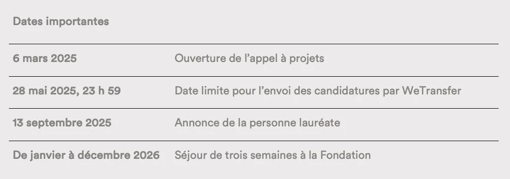Outre l’accueil à la Fondation, la résidence est dotée d’une bourse de 5 000 $ CA qui inclut une allocation de séjour, un cachet de résidence et s’il y a lieu une bourse de production.